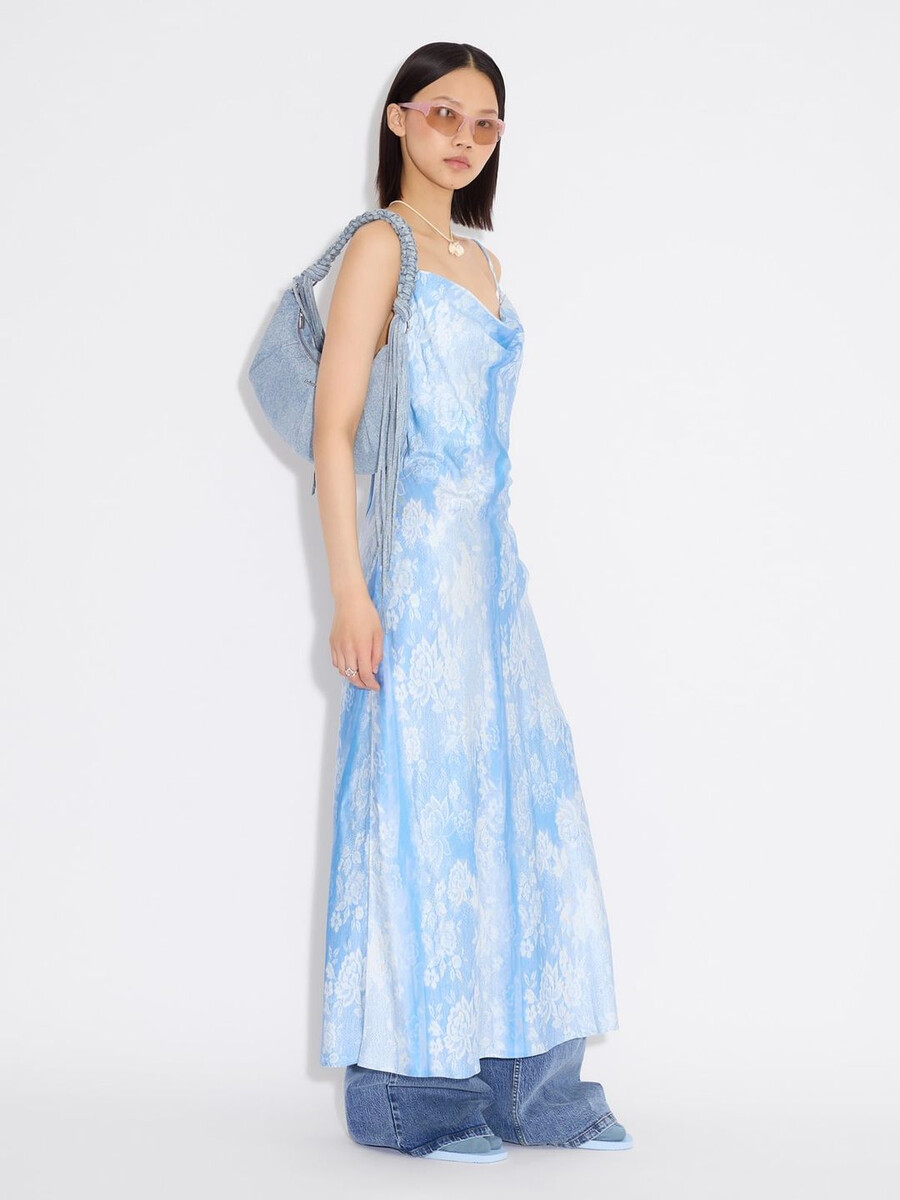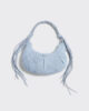 Cocoon Small Denim-väskan har en slapp design med veckade detaljer. Den hänger från en flätad axelrem som är avslutad med tofskanter. En dragkedja upptill håller dina nödvändigheter på plats.