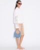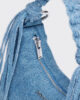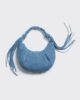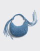 Cocoon Micro Denim-väskan har en slapp design med veckade detaljer. Den inkluderar både en axelrem och en flätad axelrem som är avslutad med tofsar. En dragkedja upptill håller dina viktiga saker på plats.