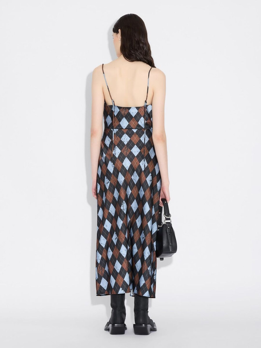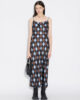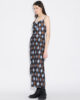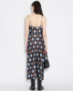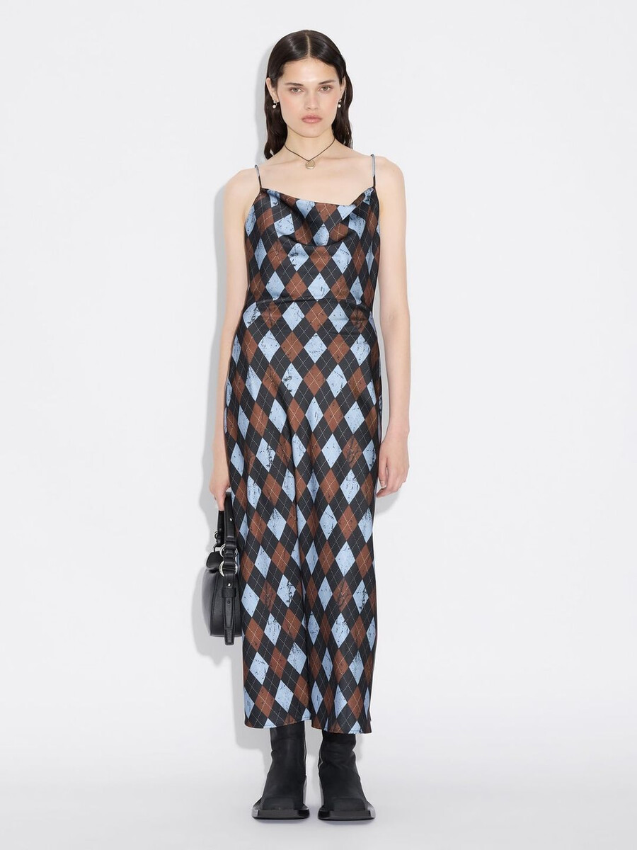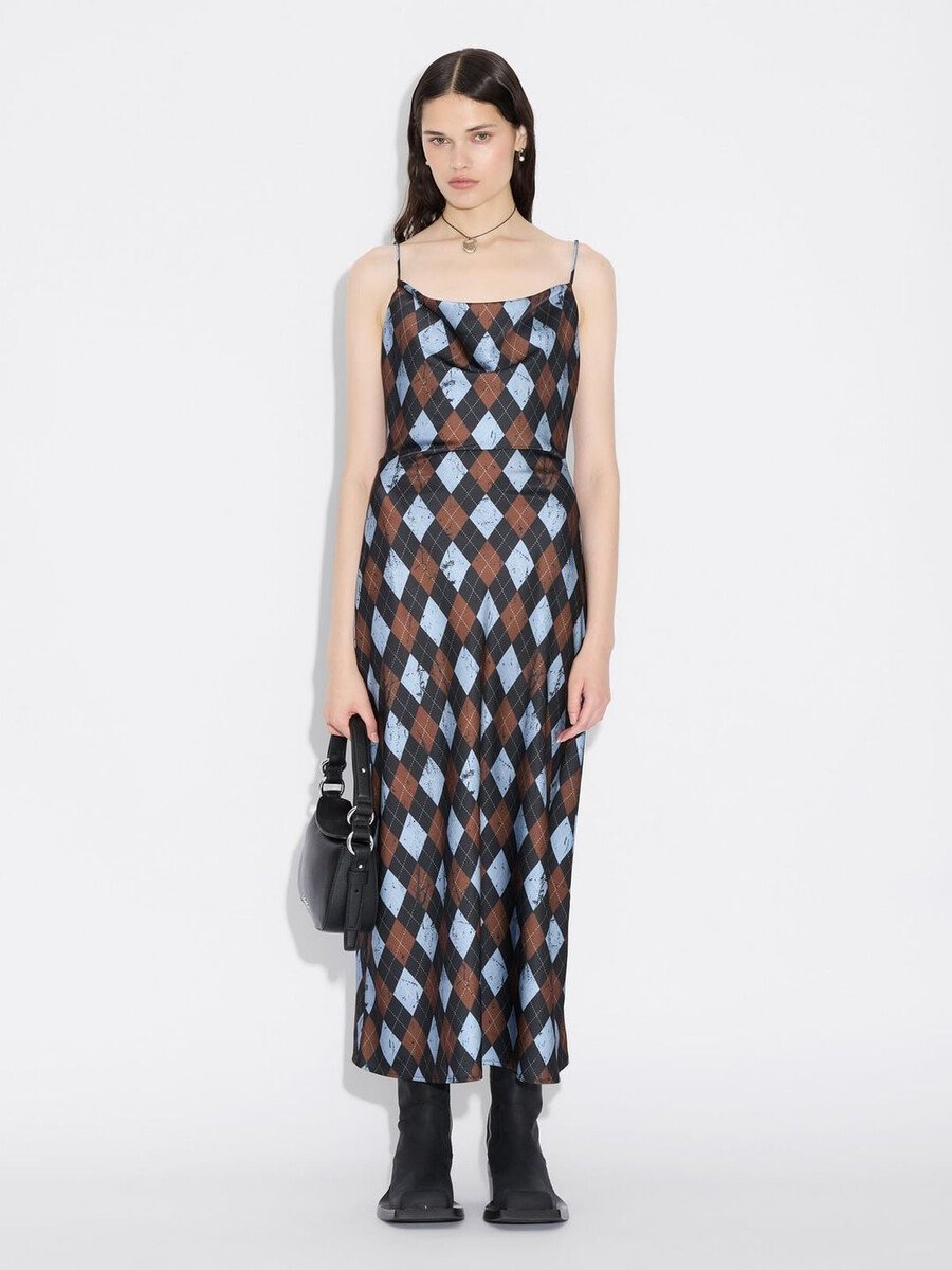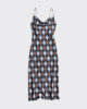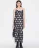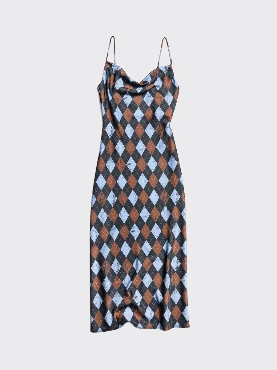 Eila-klänningen är säsongsvis omdesignad med uppdaterade tryck som återspeglar teman bakom kollektionen. Tillverkad av glänsande satin, hänger den från fina spaghettiband och har en lätt åtsittande midja.