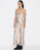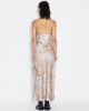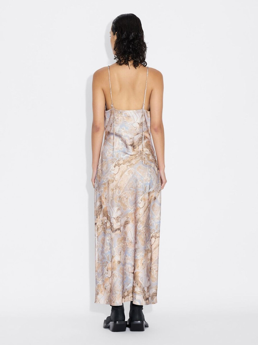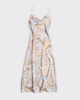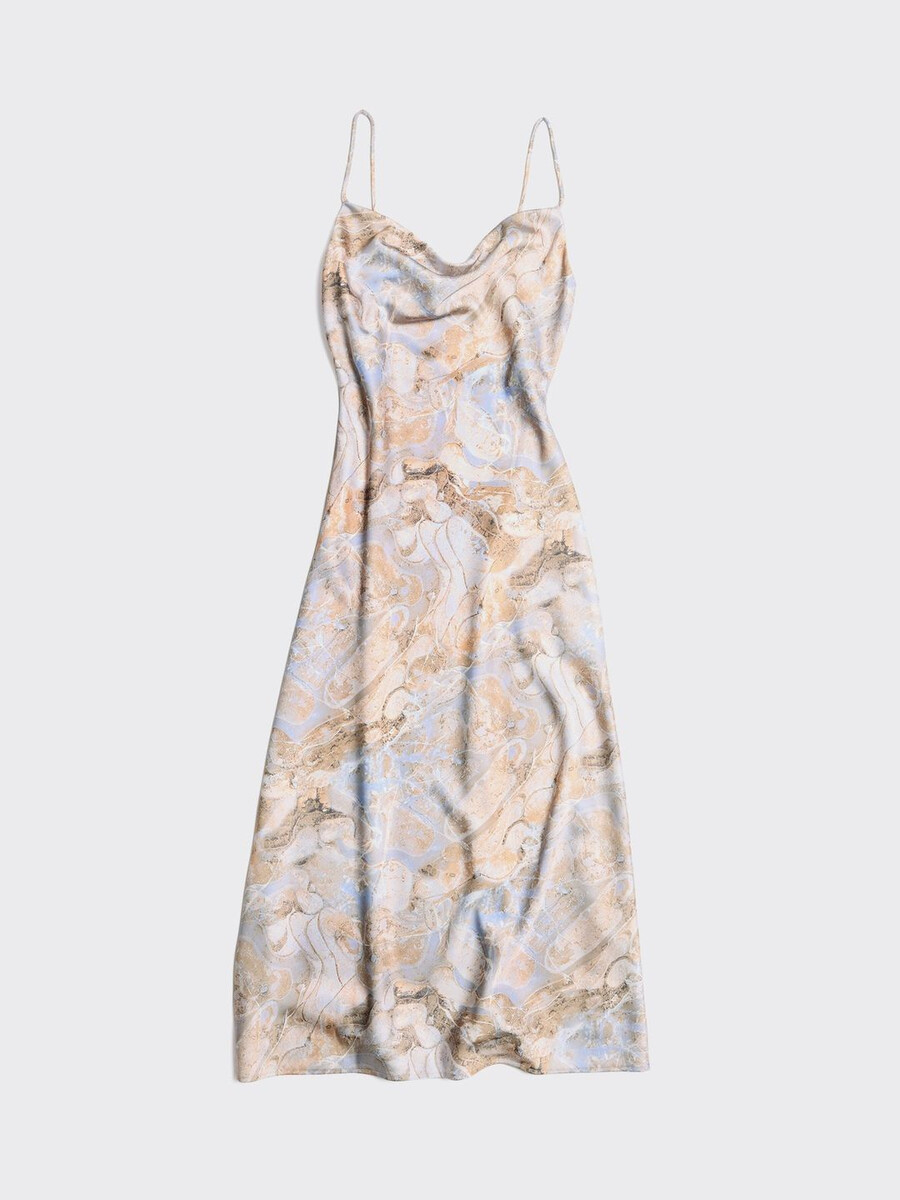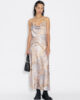 Eila-klänningen är säsongsvis omdesignad med uppdaterade tryck som återspeglar teman bakom kollektionen. Tillverkad av glänsande satin, hänger den från fina spaghettiband och har en lätt åtsittande midja.