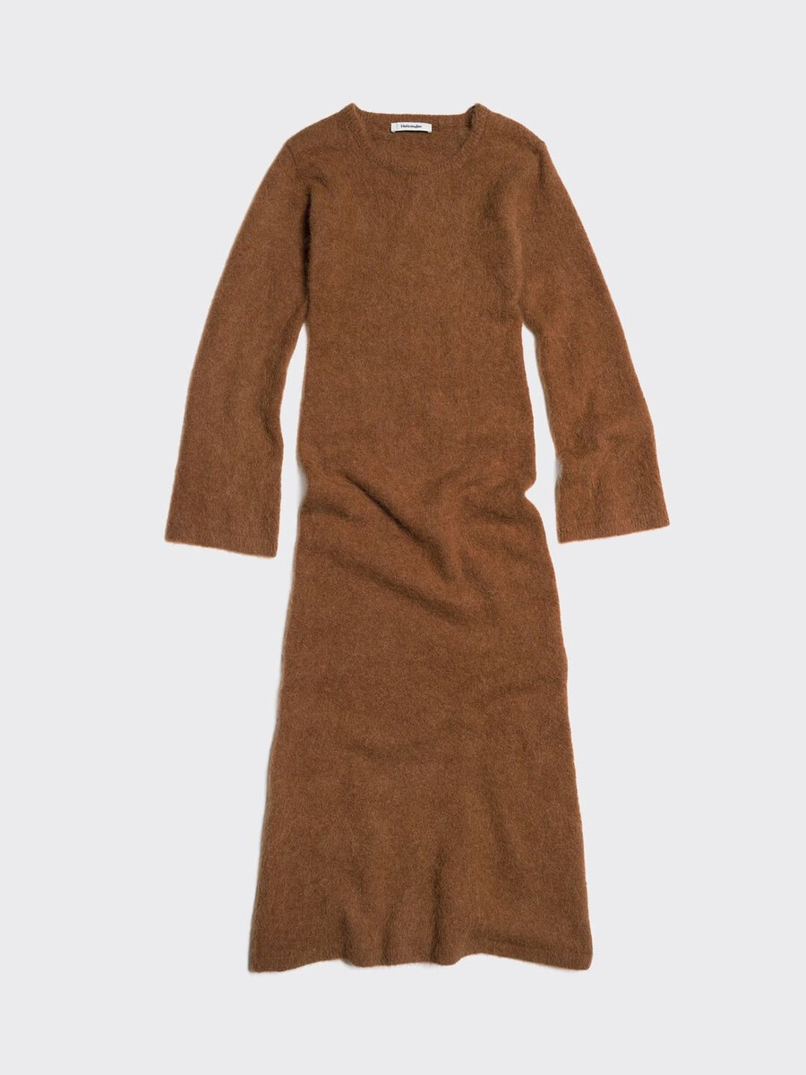 Den fluffiga klänningen är tillverkad av en taktil stickning och har rund halsringning, långa ärmar och en figurnära silhuett.