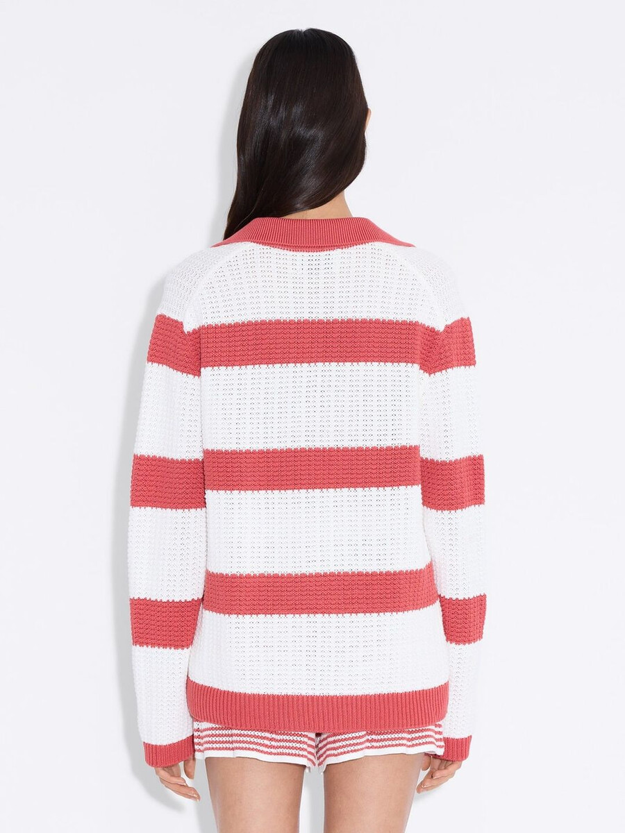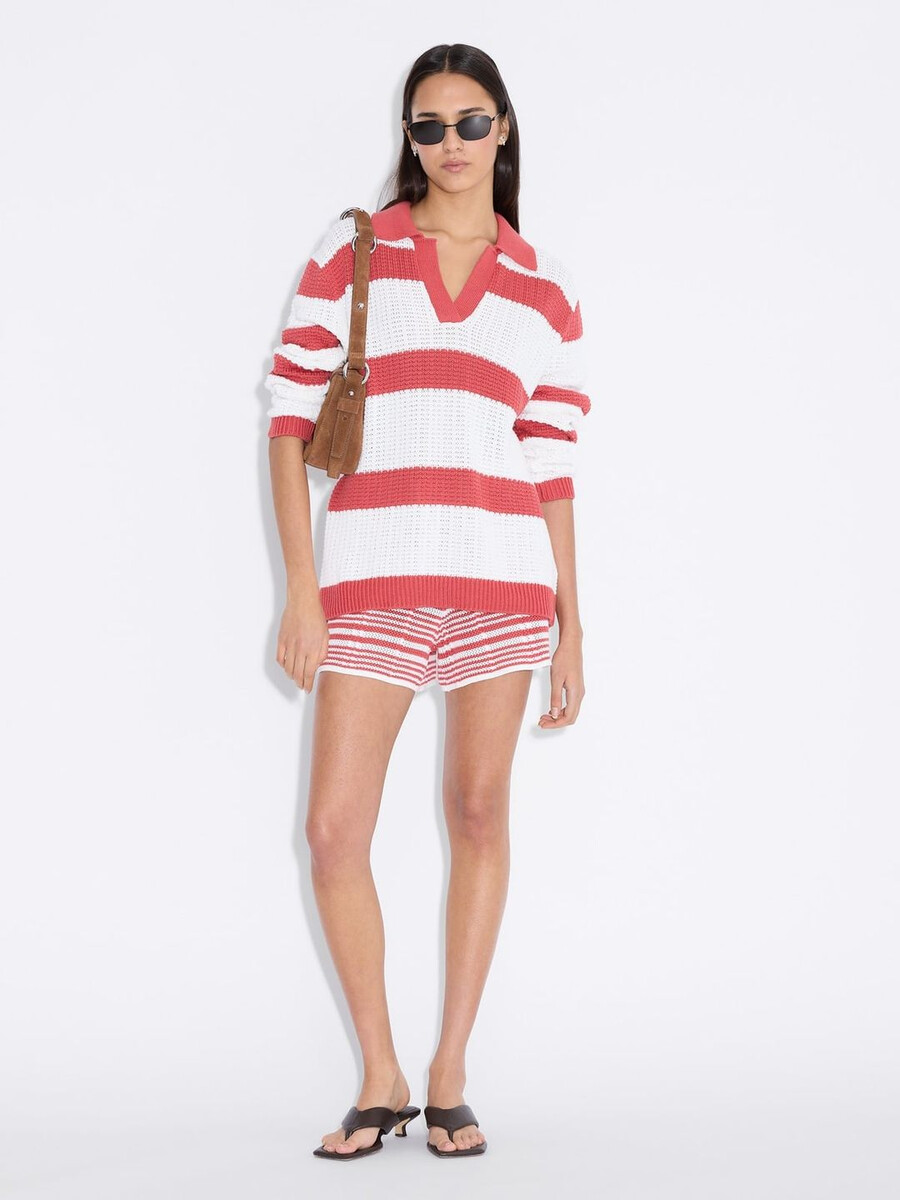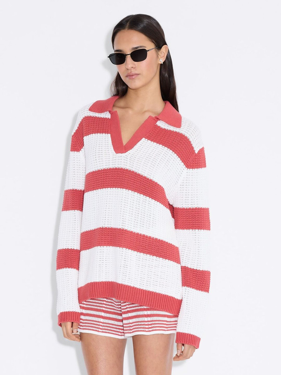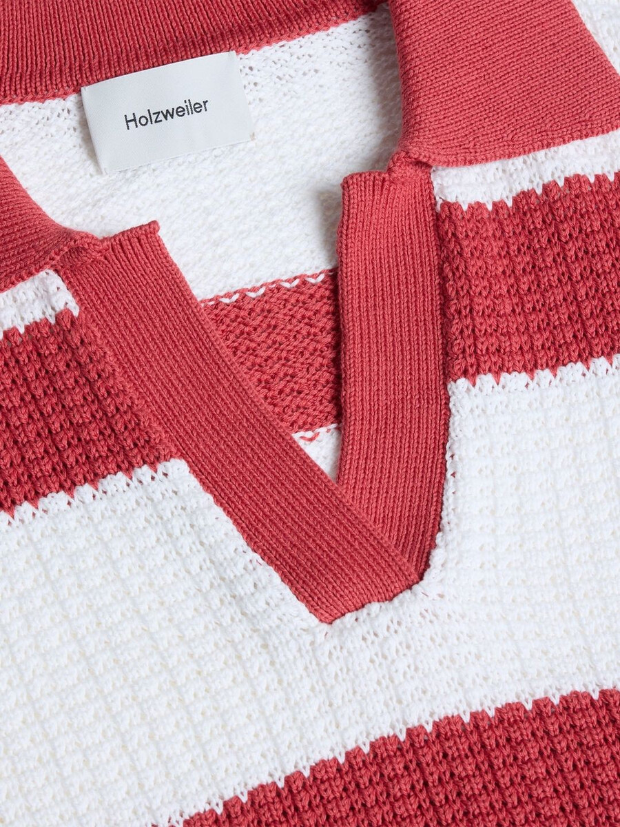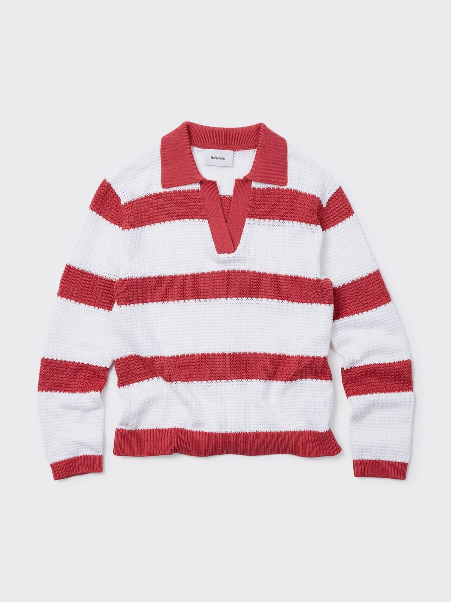 Helio-polotröjan är tillverkad av ren ekologisk bomull med ett randigt tryck. Den har en avslappnad passform, nedsänkta axlar och polokrage.