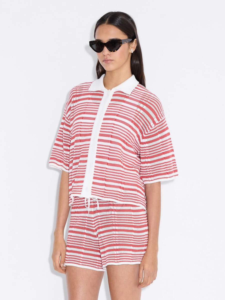 Kelp Striped skjortan är tillverkad av ren ekologisk bomull i en virkad stickning. En kortärmad modell med en oversized passform, den har en klassisk krage och en knappslå fram. Styla med de matchande Kelp Striped shortsen.