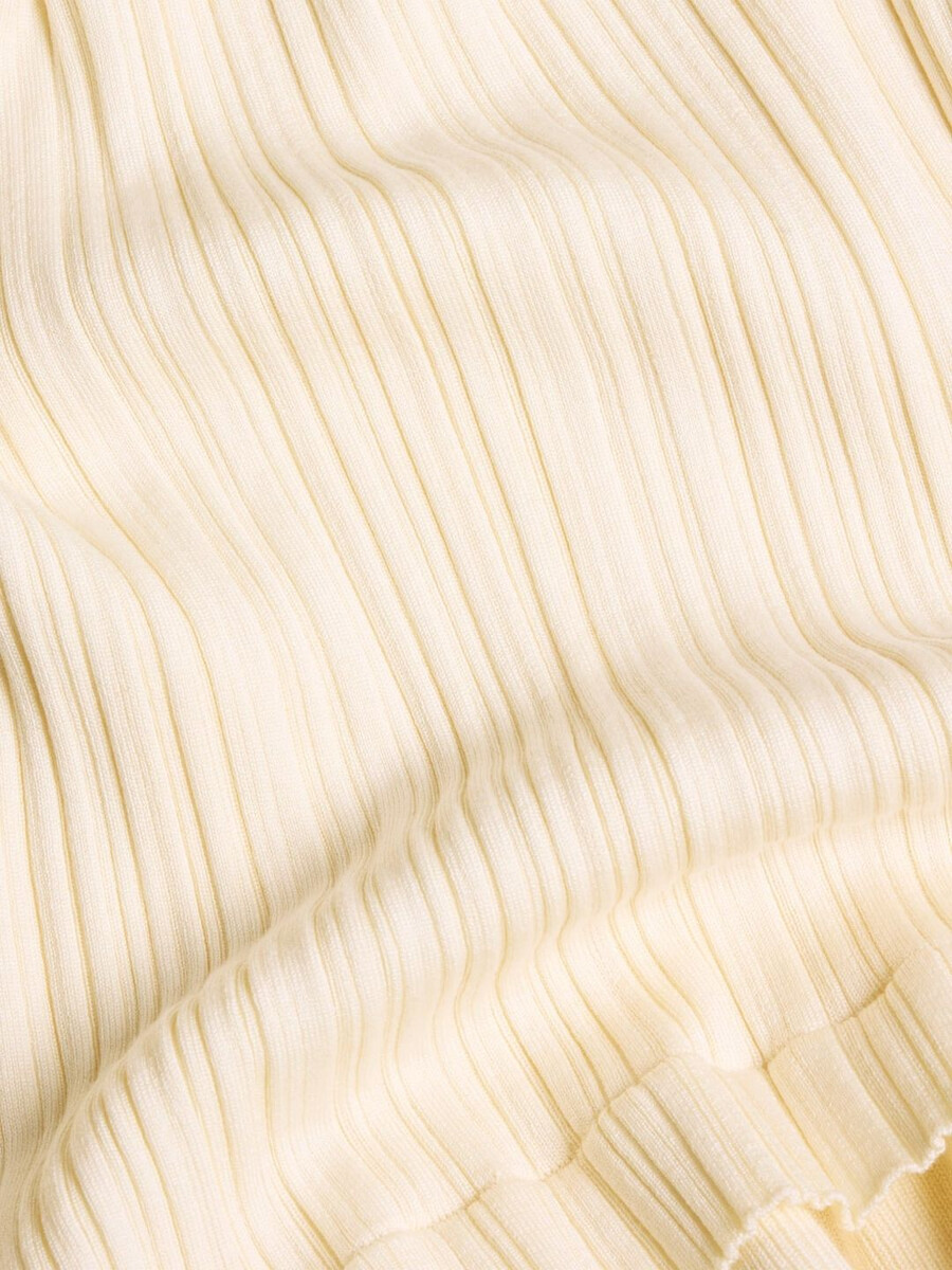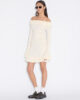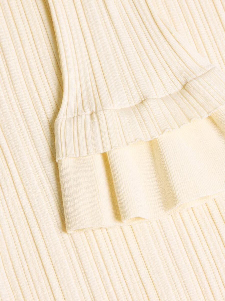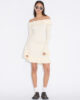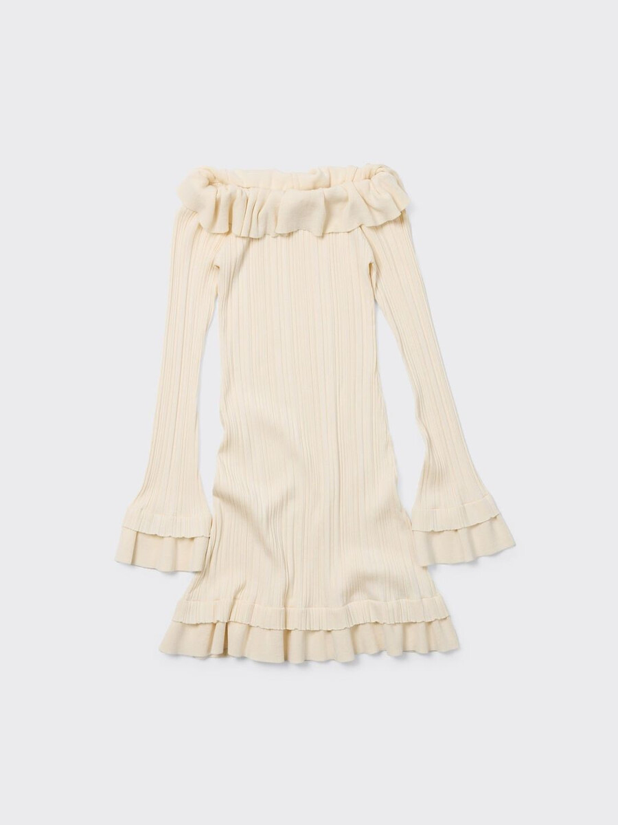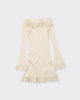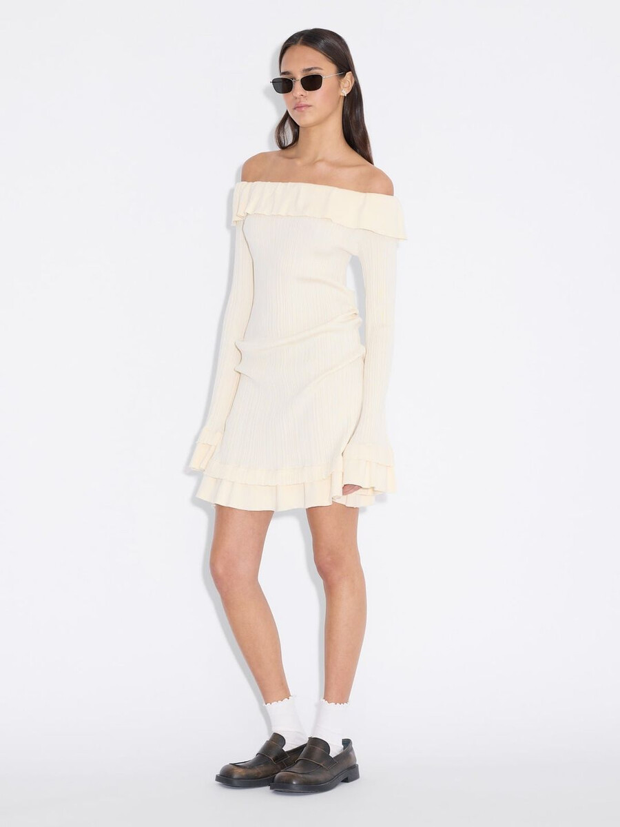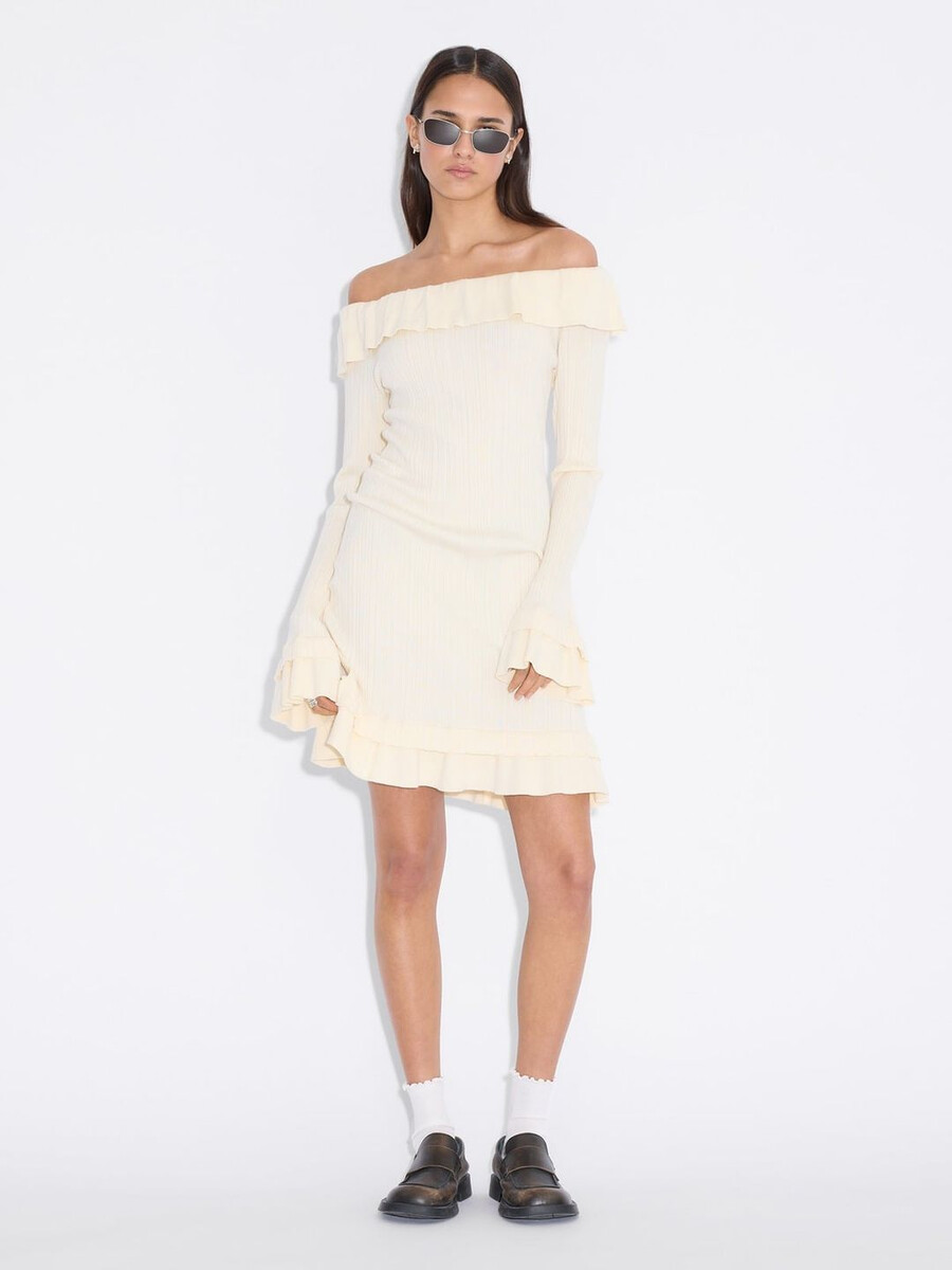 Ripple-klänningen är tillverkad av en stretchig ribbad stickning och har en off-shoulder-silhuett. Den har en lager-på-lager-konstruktion med en dubbel mini-lång fåll och förlängda ärmar.
