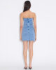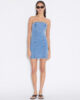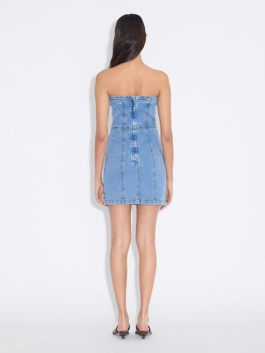 Den korta denimklänningen Kristin Short är tillverkad av ren bomullsdenim och har en axelbandslös design med en åtsittande silhuett, dragkedja bak och minilång fåll.