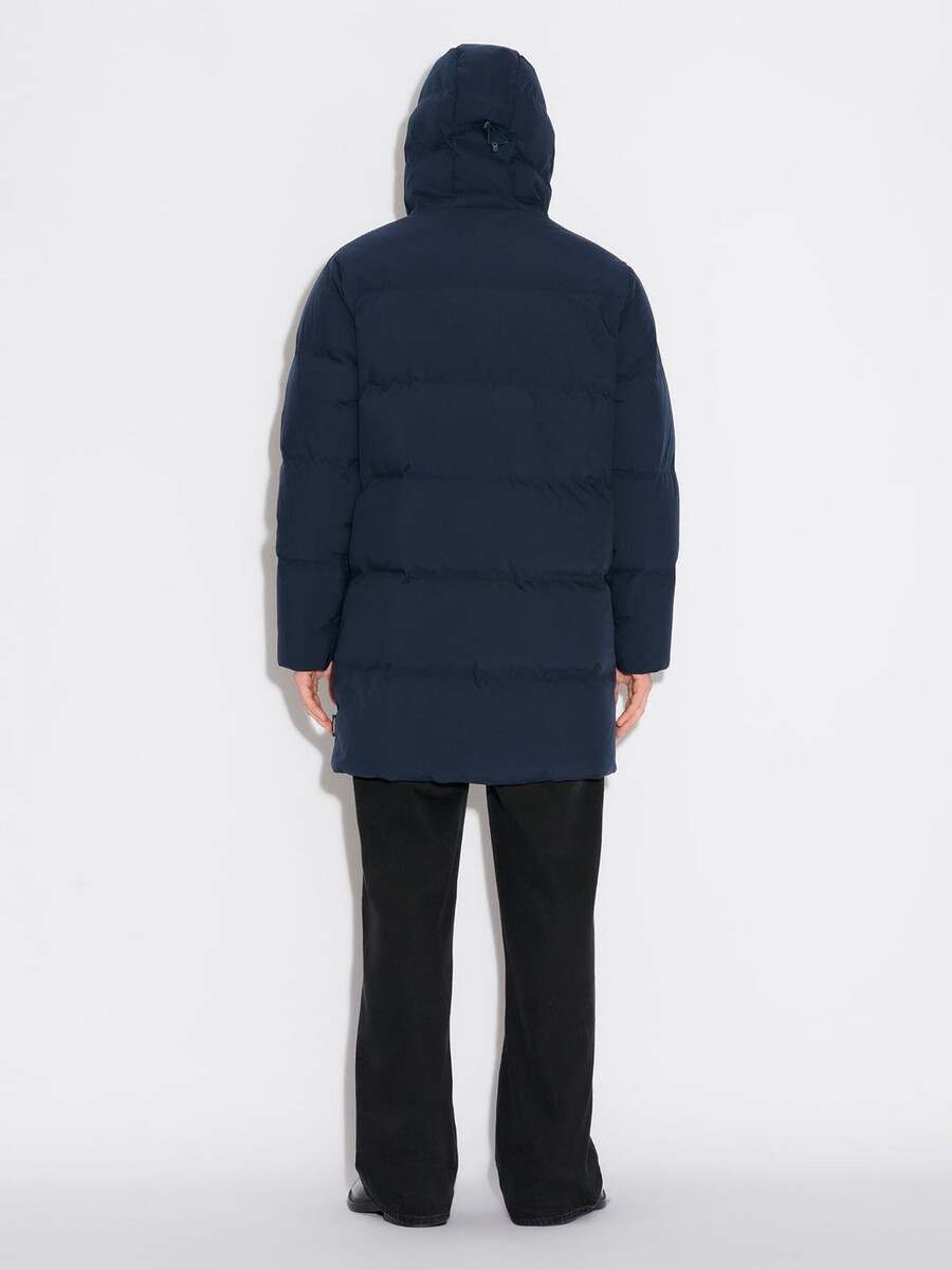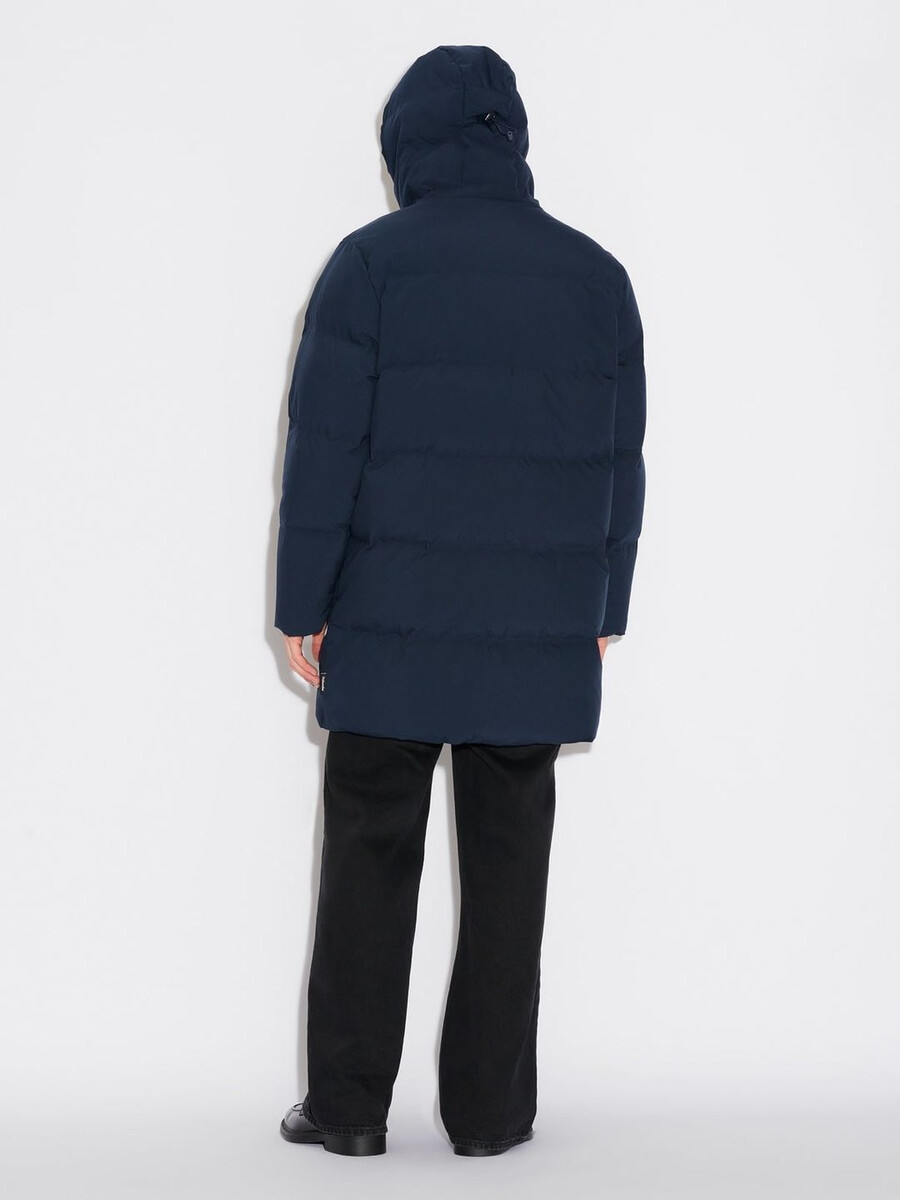 Lom-dunjackan är vadderad med RDS-certifierat dun och tillverkad av ett ansvarsfullt framställt tekniskt tyg med 10K/10K vattentät DWR-behandling. Den kommer att vara oumbärlig i din ytterklädesgrupp under de kallare månaderna. Den har en knälång design med en rak silhuett, huva, trattkrage och dragkedja framtill med en skyddande knappslå.