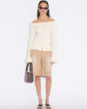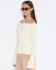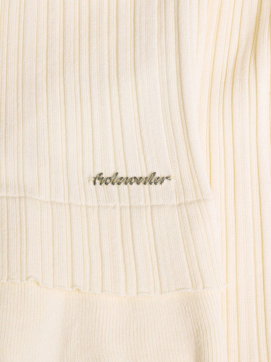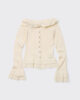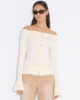 Ripple-koftan är tillverkad i lager på lager och är gjord av ribbstickat material med ett slätstickat inre lager synligt i kanterna. Den har en off-shoulder-silhuett med knäppt framtill, långa ärmar och en glänsande metalllogotypplakett framtill.