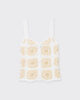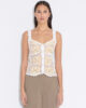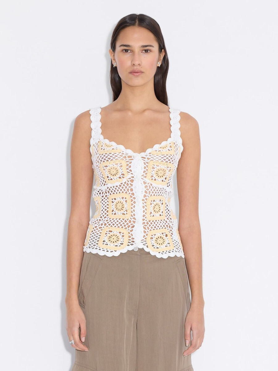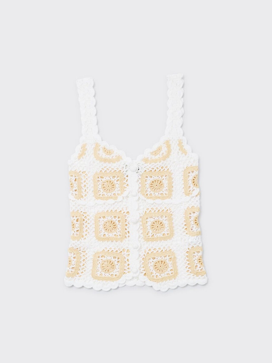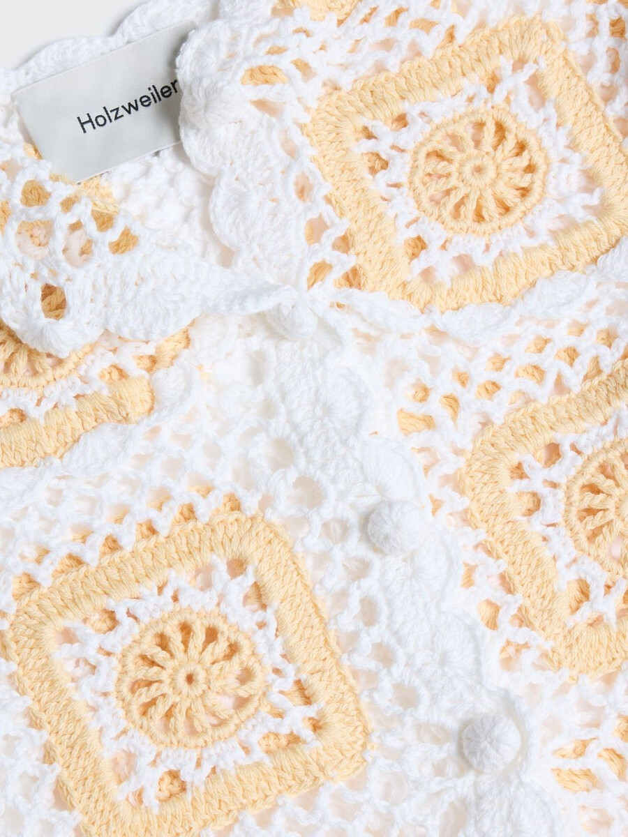 Rosie Crochet-toppen är tillverkad av ekologisk bomull. Den är detaljerad med intrikata specialmönster och har dolda knappar, en tulpanformad fåll och skråsiga kanter. Detta är en handgjord design, därför finns det ett begränsat antal tillgängligt.