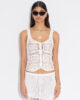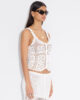 Rosie Crochet-toppen är tillverkad av ekologisk bomull. Den är detaljerad med intrikata specialmönster och har dolda knappar, en tulpanformad fåll och skråsiga kanter. Styla med den matchande Rosie Crochet-kjolen. Detta är en handgjord design, därför finns det ett begränsat antal tillgängligt.