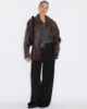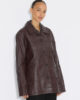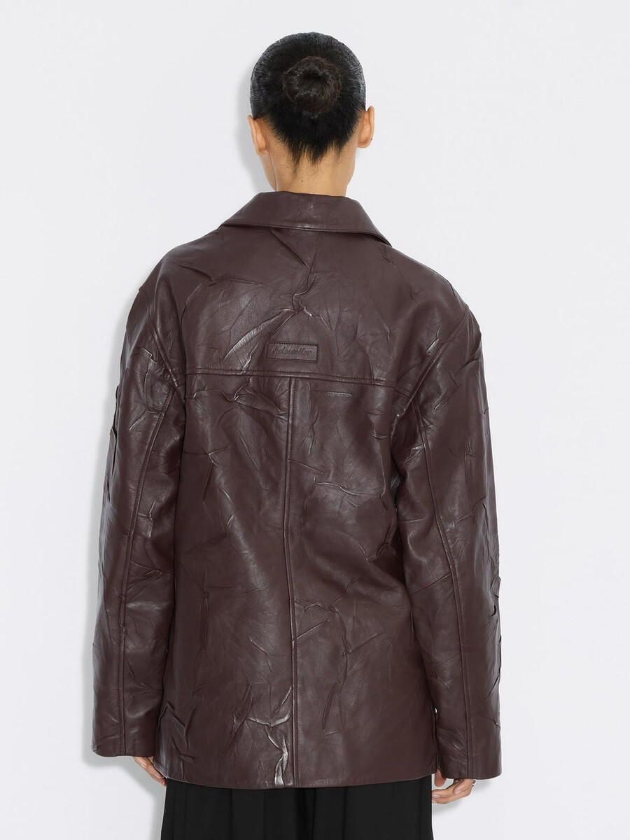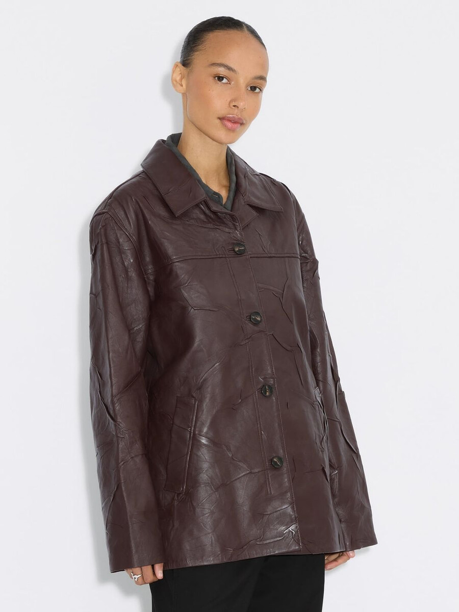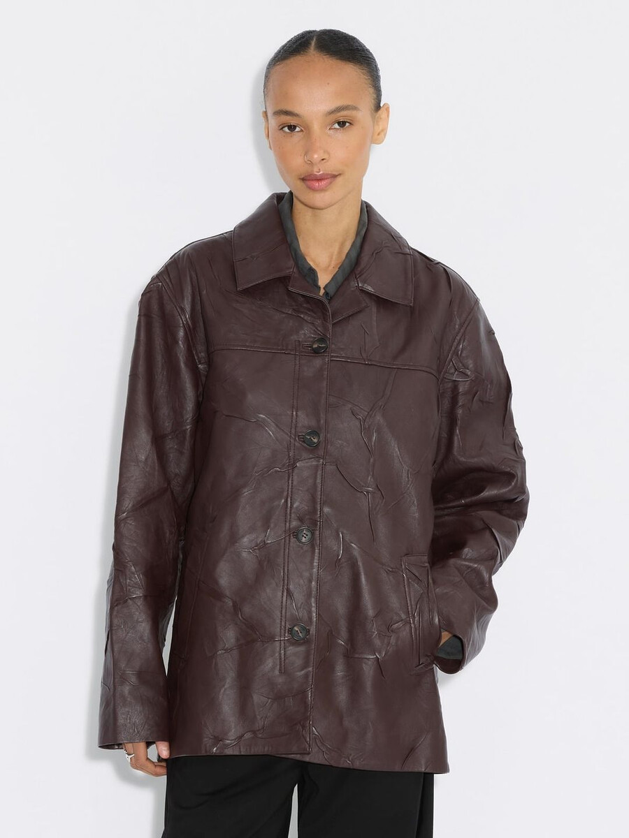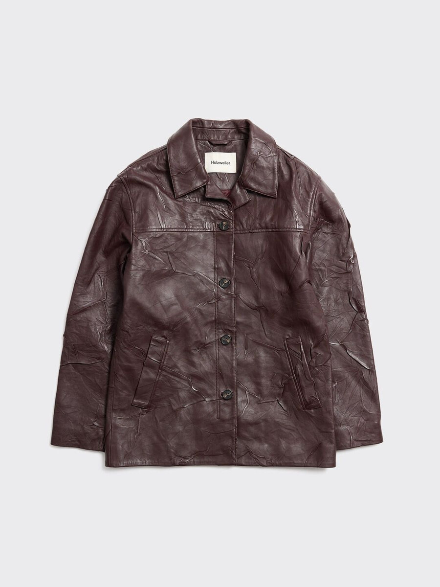 En skinnjacka är en viktig del av en tidlöst sofistikerad garderob; det är där vår investeringsvärda, mjuka skrynkliga skinnjacka kommer in i bilden. Denna jacka är ett perfekt plagg för alltid och är en lekfull skrynklig variant av den vanliga skinnmodellen. Denna lager-på-lager-modell har en elegant mellanlångt längd med knappar framtill och logotyp- och okdetaljer baktill. Den har en rik vinröd ton som frammanar lyx och passar fint ihop med jordnära färger.