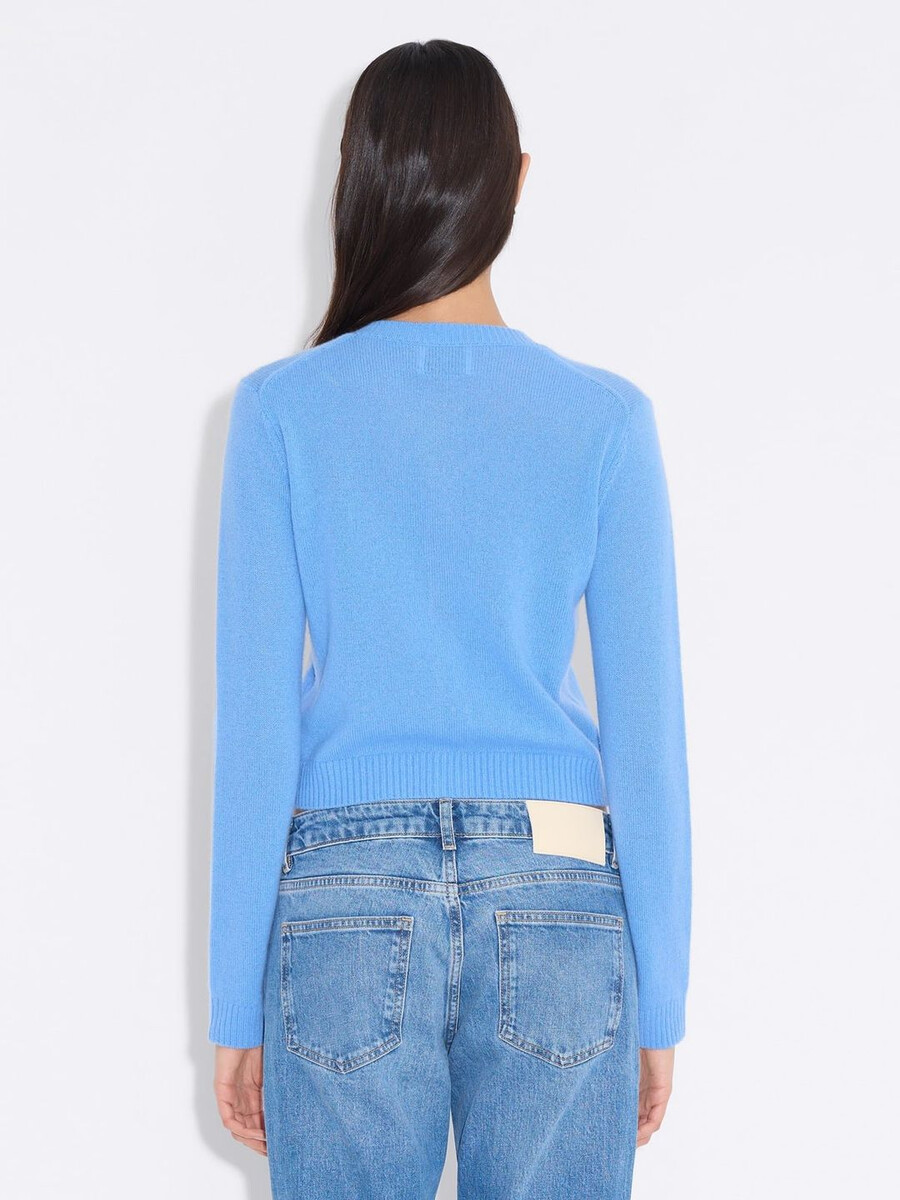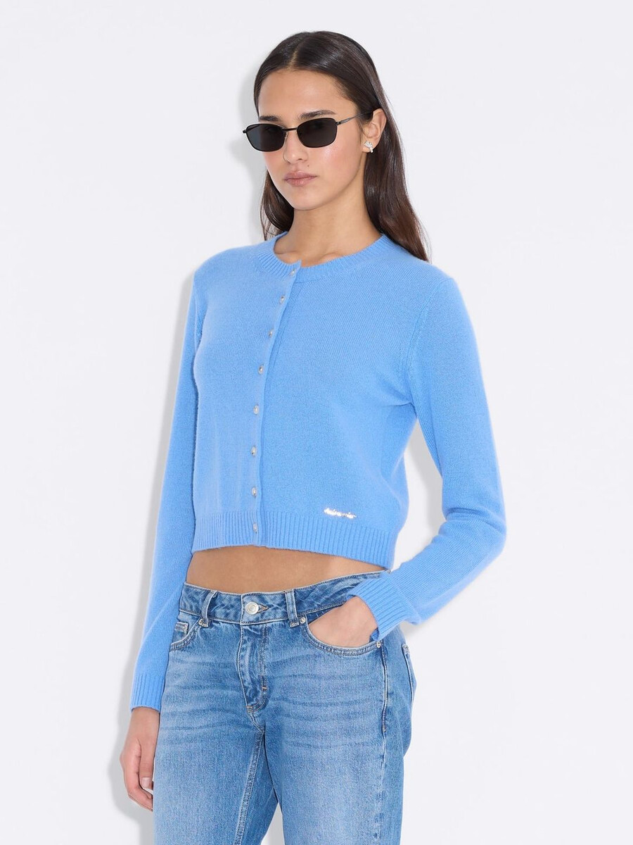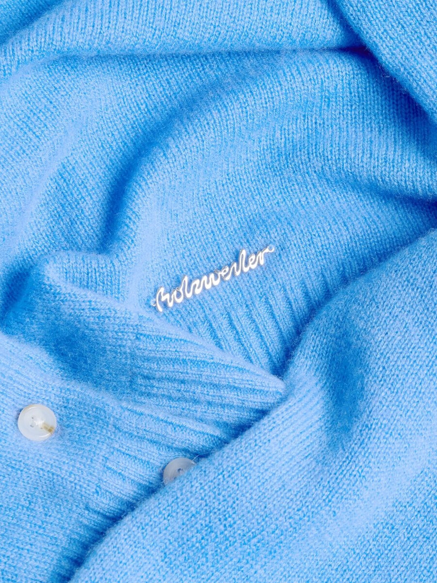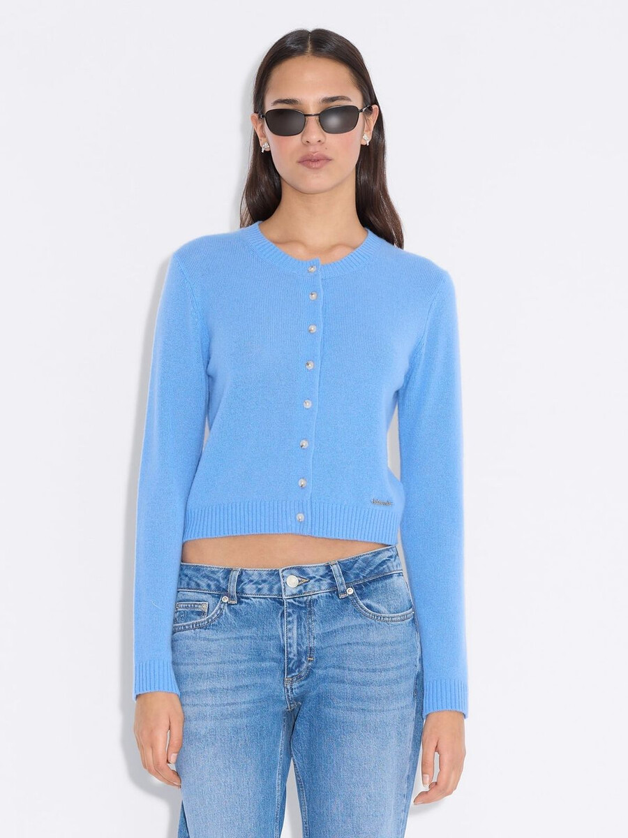 Denna kashmirkofta är tillverkad av finstickat material och har rund halsringning, knäppt framtill och ribbade kanter. Den har en avtagbar metalllogotypplakett ovanför midjan.