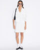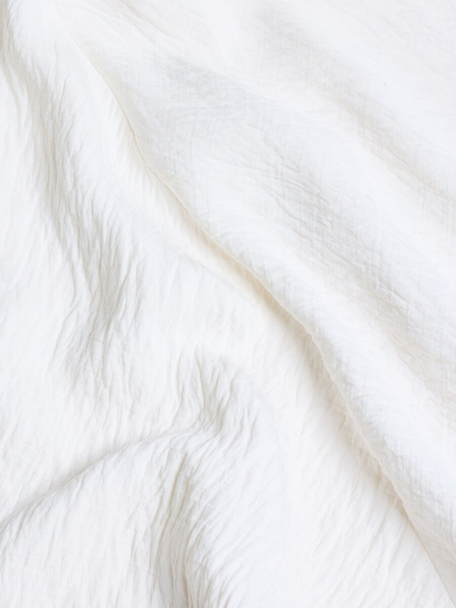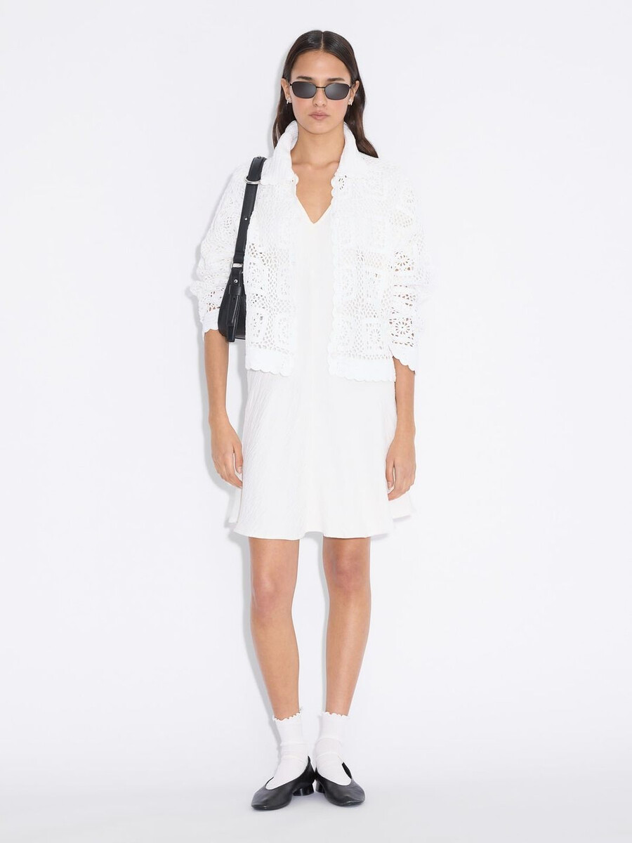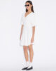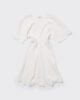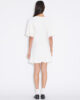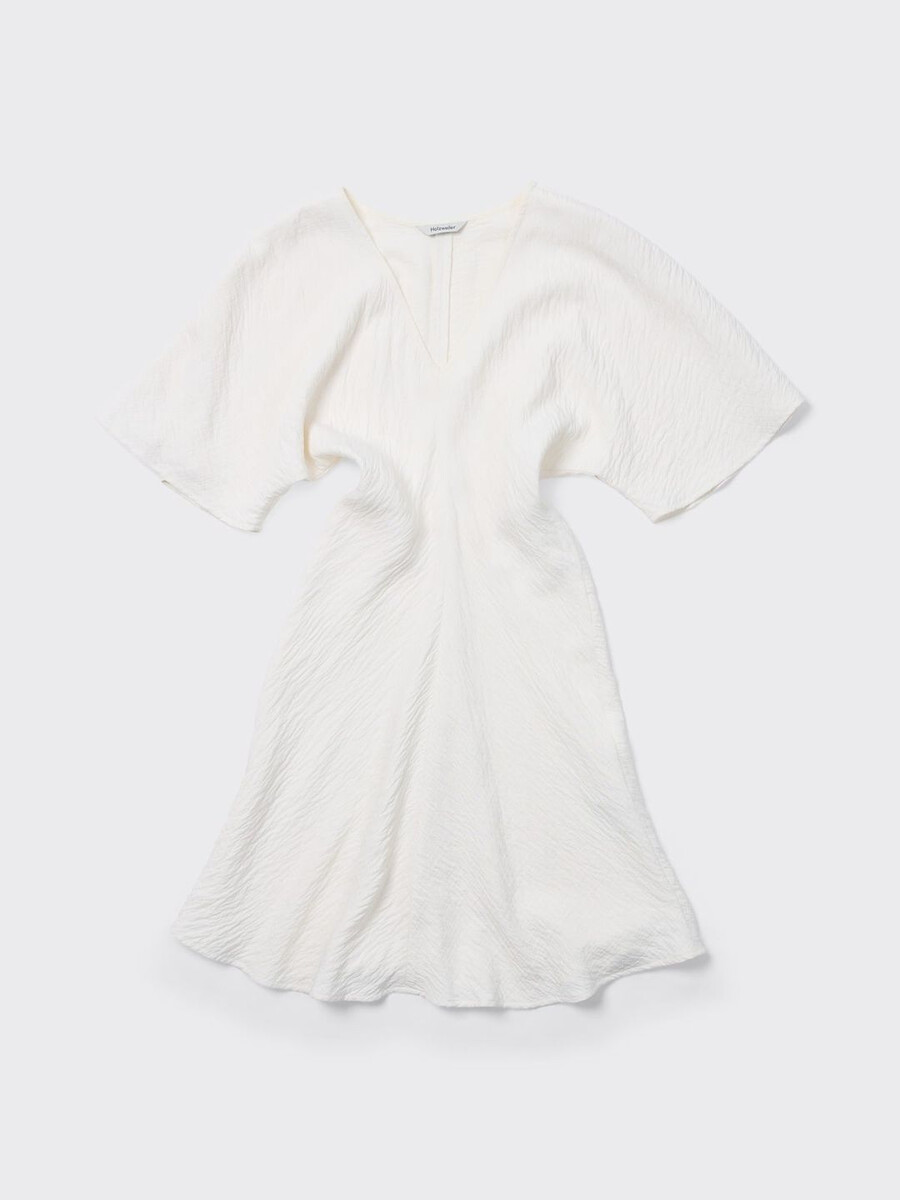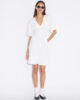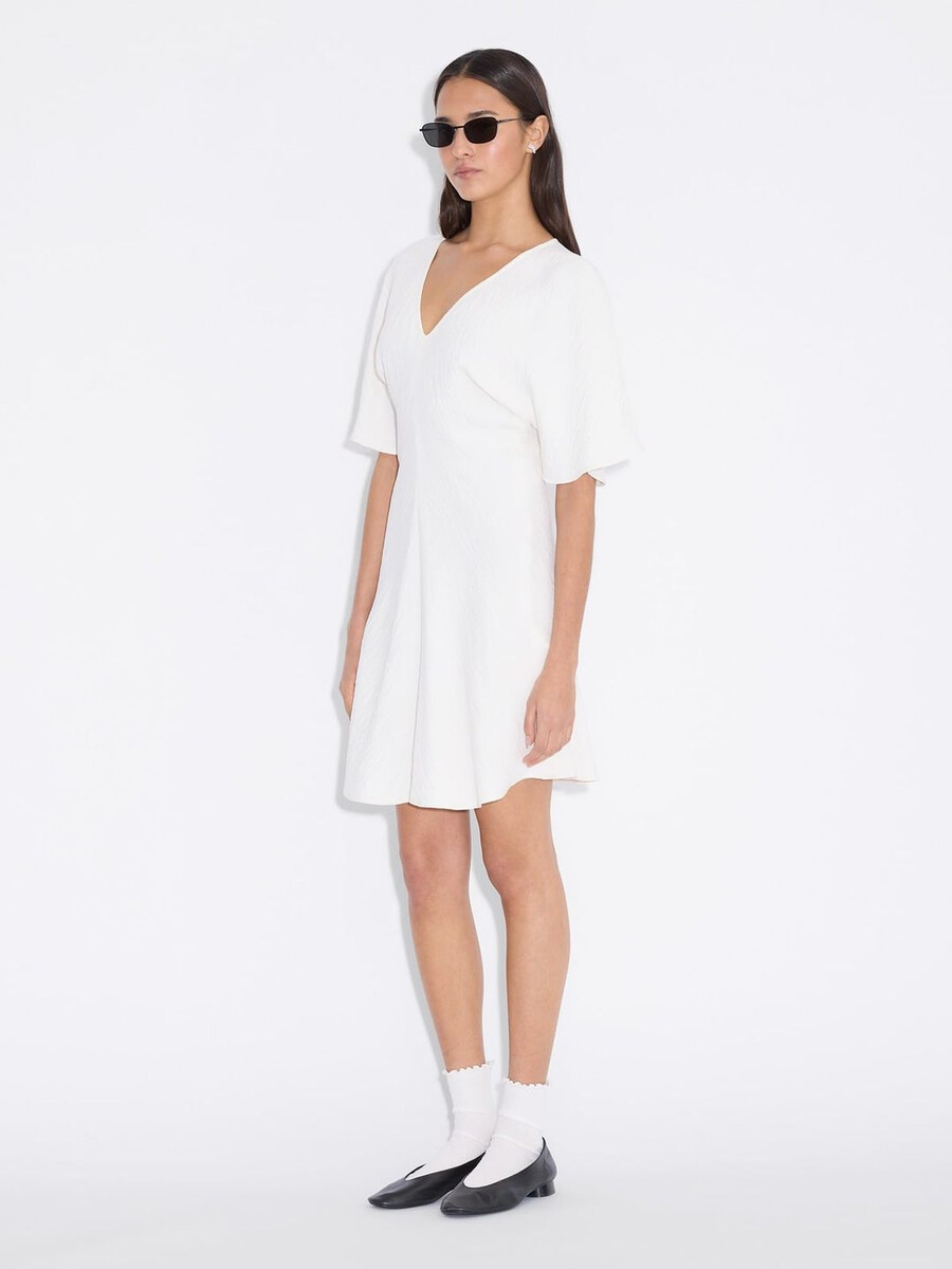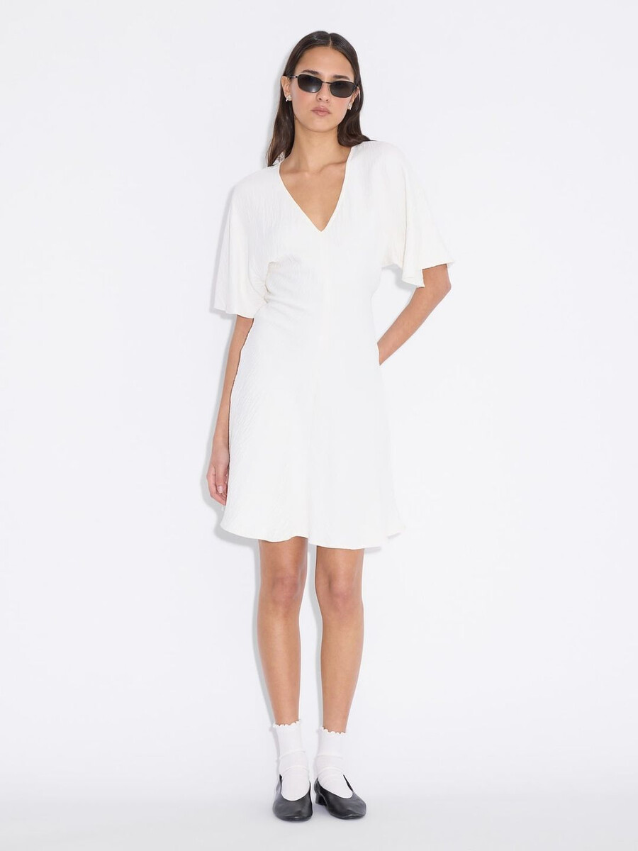 Den korta sommarklänningen är i en minimalistisk stil som definieras av subtila rynkor i midjan. Den har en djup v-ringning, korta ärmar och en A-linjeformad kjol.