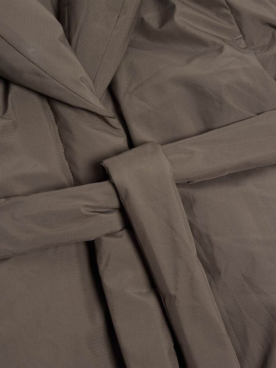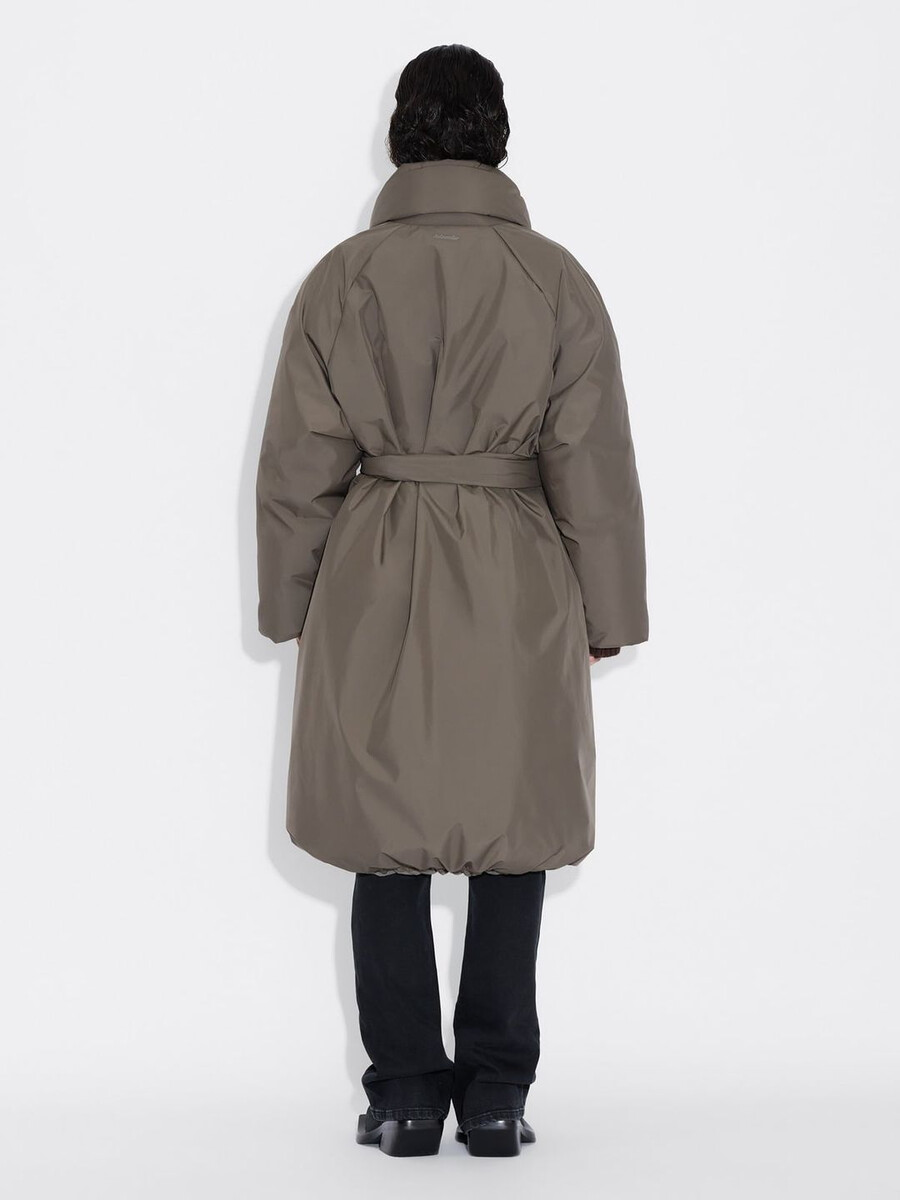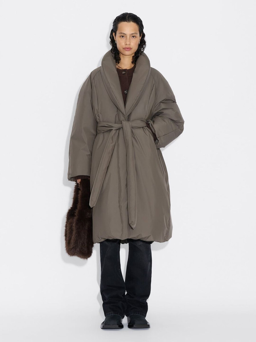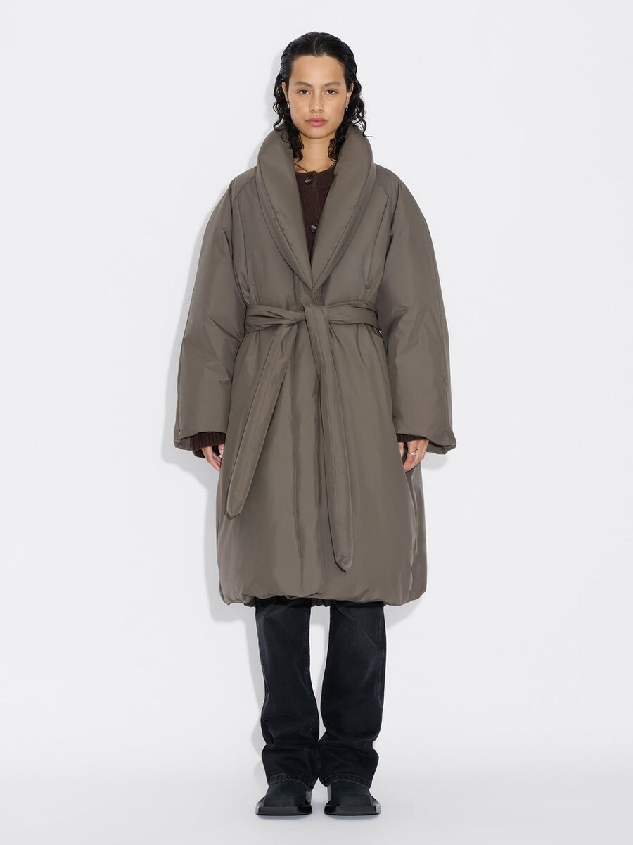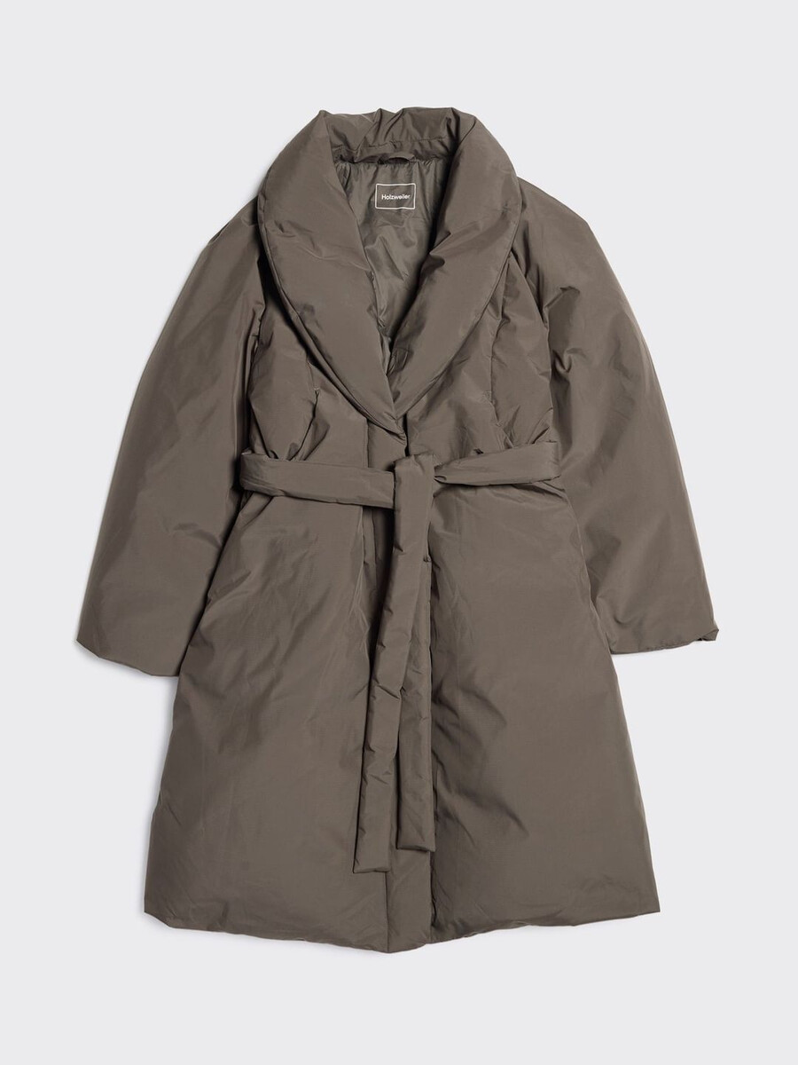 Vikki Long dunjacka har en nedanför knälång fåll som gör den lämplig både för dag och kväll. Vadderad med RDS-certifierat dun, tillverkad av ett vattenavvisande tyg och har sjalkrage, raglanärmar, flera fickor, ett självknytande avtagbart skärp och ett subtilt logotyptryck bak i nacken.